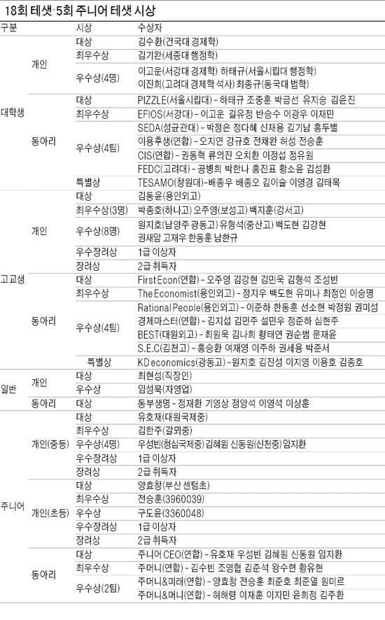 대학생 개인부문에선 김수환 씨(건국대 경제학)가 사상 첫 300점 만점으로 대상의 영예를 안았다. 김기완 씨(세종대 행정학)는 최우수상을, 이고운(서강대 경제학) 하태규(서울시립대 행정학) 이진희(고려대 경제학 석사) 최종규(동국대 법학) 씨는 우수상을 수상한다. 대상엔 상장과 상패 상금 100만원이, 최우수상은 상장과 상패 상금 50만원, 우수상은 각각 상장과 상금 20만원이 주어진다.