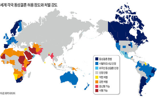 2001년 네덜란드에서 처음으로 합법화한 동성결혼은 10여년 만에 벨기에 스페인 캐나다 노르웨이 스웨덴 포르투갈 아일랜드 남아프리카공화국 아르헨티나로 확산됐다. 멕시코의 수도 멕시코시티도 동성결혼을 인정한다. 태국 의회는 최근 동성결혼 합법화 법안을 상정했다. 호주와 영국, 독일 등 20개국은 동거하는 동성커플에게 결혼한 부부와 동일한 권리를 부여하는 ‘시빌 파트너십(civil partnership)’제도를 시행하고 있다.