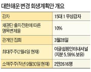 변경 회생계획안에 따르면 대한해운은 15 대 1의 감자를 실시한다. 기존 주주들은 보유주식이 15주당 1주로 줄어든다. 감자로 인해 주식 수가 줄어들긴 하지만 상장이 유지되면 투자금을 회수할 수 있는 길이 열려 소액투자자들에게도 희소식이다. 작년 9월30일 기준 대한해운의 소액주주는 2만2616명. 매매 정지 직전 대한해운 주가는 6900원이었다. 채권단은 대출금을 대한해운 출자전환 주식으로 받는다. 명목변제율은 10%다.