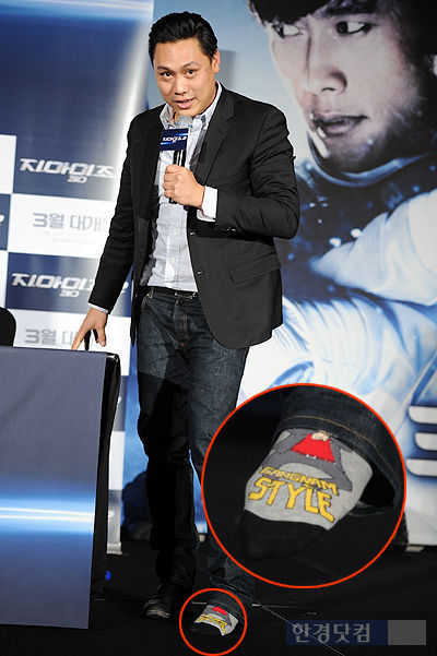 존 추 감독이 11일 오전 서울 여의도 콘래드호텔에서 열린 영화 '지.아이.조2'(감독 존 추) 내한 기자회견에 참석해 '강남스타일'이 새겨진 양말을 보이고 있다.