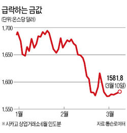 지난 1월22일 온스당 1695달러이던 금값이 10일(현지시간) 1582달러(시카고상업거래소 6월 인도분 기준)로 7.1%나 하락하면서 투자자들 간 금값 향방을 둘러싼 논쟁이 뜨거워지고 있다.