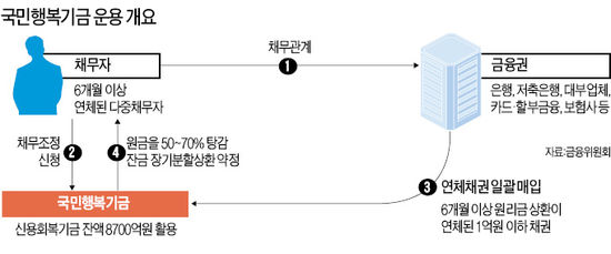 기금 재원으로는 신용회복기금 잔액 8700억원(현금 5000억원 포함)을 먼저 활용할 계획이다. 연채 채권의 할인매입률을 4~8%의 할인율로 따지면 최대 22조원의 연체채권을 정리할 수 있을 전망이다.