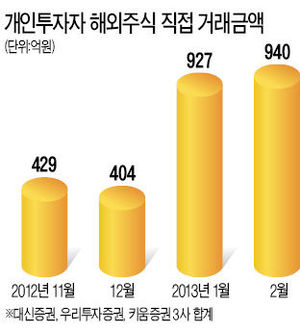 2008년 상반기 이후 환매가 계속돼온 해외 주식형펀드도 기지개를 펴고 있다. 지난해 하반기부터 과거 수익률이 좋았던 펀드를 중심으로 자금이 꾸준히 유입되고 있다. 해외 주식형펀드의 지난 6개월간(7일 기준) 평균 수익률은 13.96%에 달한다. 자산가들을 중심으로 미국, 홍콩 주식시장에서 직접 종목 투자에 나서는 이들도 빠르게 늘어나고 있다. 아예 해외 선물·옵션 등에 공격적으로 투자하는 개미들도 증가세다.
