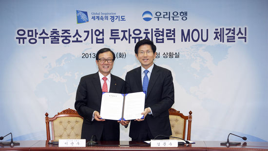 김문수 경기도지사와 이순우 우리은행장은 12일 오후 5시 경기도청 상황실에서 이같은 내용을 담은 ‘수출 중소기업의 자금난 해소를 위한 투자유치협력 양해각서’를 체결하고 경기도내 중소기업을 위한 자금과 기업맞춤형 종합 컨설팅 지원 등에 합의했다.