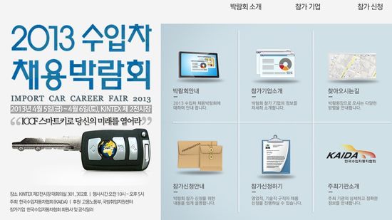 한국수입자동차협회(KAIDA)는 다음달 5일부터 6일까지 이틀 간 '2013 수입차 채용박람회'를 개최한다고 13일 밝혔다. 이번 박람회는 일산 킨텍스 제2전시장 3층 대회의실에서 오전 10시부터 오후 5시까지 열린다.