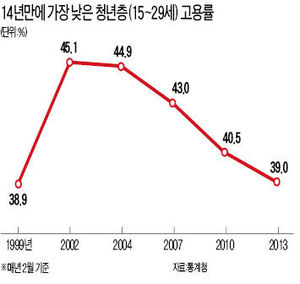 지난달 청년층(15~29세) 인구 중 취업자 비중(고용률)이 14년 만에 최저로 떨어졌다. 생산가능인구(15~64세) 기준 고용률도 2년 만에 가장 낮은 62%대로 떨어지면서 박근혜 정부가 핵심 국정목표로 내세운 ‘고용률 70%’와의 괴리가 커졌다. 통계청이 13일 발표한 ‘2월 고용동향’에 따르면 지난달 고용 지표가 일제히 나빠진 것으로 나타났다. 전체 취업자 수는 2398만4000명으로 1년 전보다 20만1000명 증가하는 데 그쳤다. 지난해 2월 44만7000명 늘어난 것과 비교하면 신규 일자리 수가 ‘반토막’난 것이다.