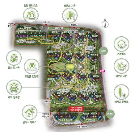 조경공간은 계절마다 다른 꽃과 나무를 즐길 수 있는 다양한 테마로 꾸며진다. 가벼운 운동을 할 수 있는 에세이 산책로와 텃밭공간을 조성한 로맨스 가든이 있어 단지 보는 조경이 아닌 체험을 더한 공간으로 계획한 것이 특징이다.