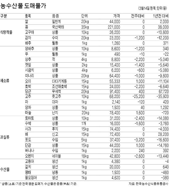 14일 서울 가락시장에서 시금치 상품(上品) 한 상자(4㎏)의 평균 경락가는 5597원으로, 작년 이맘때(8127원)보다 31.1% 싸졌다. 달래 상품 한 상자(4㎏)도 2만5000원에 거래돼 작년 같은 기간(4만2500원)보다 41.1% 내렸다. 미나리 상품 한 상자(4㎏)는 작년(1만1656원)보다 14.8% 싼 9924원을 나타냈다.