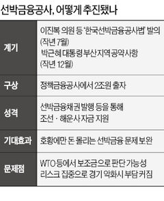 선박·해운금융공사 설립안은 작년 7월 이진복 새누리당 의원 등이 ‘한국선박금융공사법’을 발의해서 논의가 시작됐다. 대선 과정에서 박 대통령이 부산지역 민심을 잡기 위해 이를 공약으로 채택했다. 지난 5일 김정훈 정무위원장(새누리당) 등이 ‘한국해양금융공사법’을 또 발의했다. 선박금융공사의 확대 버전이다. 현재 국회 정무위원회에는 두 법안이 동시에 계류돼 있는데, 좀 더 광범위한 형태인 해양금융공사법으로 통합 심사할 가능성이 높다.