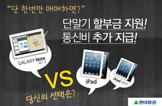 현대증권은 다양한 기종의 태블릿PC들이 경쟁적으로 출시됨에 따라 고객 취향과 편의에 맞는 태블릿PC를 선택하여 사용할 기회를 제공한다.