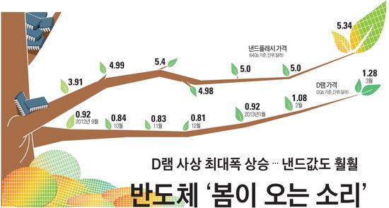 D램 값은 2011년 6월부터 하락하다 지난해 2월 이후 상승세를 탔다. 7월 이후 급락세를 보였지만 작년 말부터 재반등하고 있다.