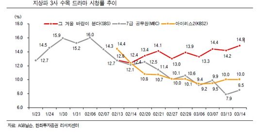 21일 한국거래소에 따르면 SBS콘텐츠허브 주가는 '그 겨울' 첫 방영일인 지난 2월13일부터 전날까지 약 10% 올랐다. 같은 기간 코스피지수가 0.8% 후퇴한 데 비하면 돋보이는 성적이다.