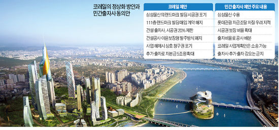 용산개발에 출자한 17개 건설사 가운데 최대 지분(6.4%)을 보유한 삼성물산은 111층 높이의 랜드마크 빌딩의 시공권(1조4000억원)을 내놓기로 했다. 단 코레일과 세부 협의를 거쳐 수용여부를 통보할 계획이다. 코레일은 그동안 삼성물산이 투자한 전환사채(CB) 688억원을 돌려주는 대신 랜드마크 빌딩 시공권을 포기하라고 요구해왔다.
