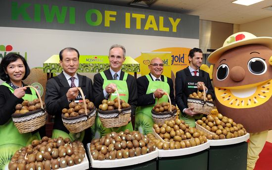 이마트는 이탈리아 키위연합회와 전략적 제휴를 통한 런칭 행사를 개최, 21일 서울 성수동 성수점에서 관계자들이 이탈리아 골드키위와 그린키위 를 선보이고 있다. 가격은 진골드키위 8~10입(1팩) 9800원, 키웨이 그린키위 8~10입(1팩) 4800원이다. 왼쪽부터 엔젤오차드 김희정 대표, 허인철 이마트 사장, 세르지오 메르쿠리 주한이탈리아 대사, 굴리에르모 갈리 이탈리아 서울무역관 관장, 알레산드로 포르나리 이탈리아 키위연합회 대표.