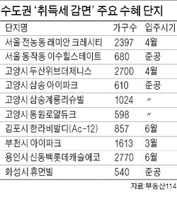 이미 지어진 ‘준공 후 미분양 아파트’도 취득세 감면 수혜 대상이다. 계약과 함께 즉시 입주가 가능하고 취득세도 감면받을 수 있다. 지난 1월 말 기준으로 전국의 준공 후 미분양 주택은 2만8248가구다. 함영진 부동산114 리서치센터장은 “서울에서는 동작·마포구 일대 ‘중대형 준공 미분양’ 물량이 많은 편이고 수도권에서는 △고양 삼송지구 △김포 장기지구 △인천 영종지구 등을 주목해볼 만하다”고 설명했다.