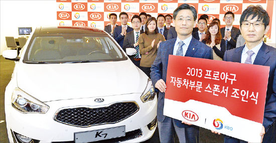 기아자동차는 25일 서울 압구정동 사옥에서 한국야구위원회(KBO)와 2013 프로야구 자동차부문 공식 후원 계약을 체결했다. 후원 계약 체결에 따라 기아차는 올해 프로야구 주요 경기에 시구 차량을 지원하고 올스타전, 한국시리즈 최우수 선수에게 MVP 차량을 제공한다. 서춘관 기아차 국내마케팅실장(오른쪽)과 양해영 KBO 사무통장이 후원 계약을 체결한 뒤 기념촬영을 하고 있다.