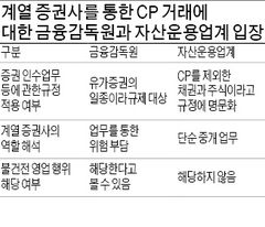 금감원은 CP도 유가증권의 일종인 만큼 회사채와 마찬가지로 계열 증권사를 통한 거래를 불건전 영업행위로 볼 수 있다는 입장이다. 자산운용사들은 머니마켓펀드(MMF)를 운용하면서 계열 증권사가 중개한 CP를 아무런 제약 없이 편입했다.