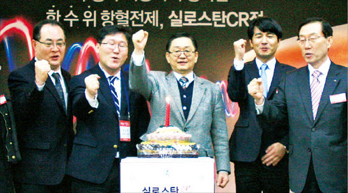 한국유나이티드제약(사장 강덕영)은 26일 서울 역삼동 유나이티드문화재단 아트홀에서 자체 개발한 항혈전제 개량신약 ‘실로스탄 CR정’의 발매 기념식을 가졌다. 강덕영 사장(가운데)이 충남대병원 임상시험센터의 홍장희 교수(왼쪽) 등 개발 관계자들과 파이팅을 외치고 있다.