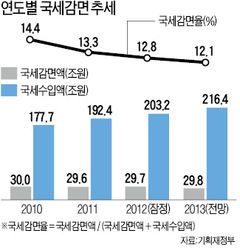 재정부 관계자는 “복지재원 마련을 위해 올해 정기국회 때 세법을 개정, 내년에만 1조8000억~2조원 비과세 감면혜택을 줄일 계획”이라고 말했다. 이렇게 하면 2017년까지 5조4000억~6조원을 줄일 수 있다. 올해 일몰이 도래하는 감면 건수와 세액은 44건, 1조7000억원이다.