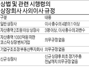 현행 상법에는 ‘상장회사는 이사 총수의 4분의 1 이상을 사외이사로 해야 한다’는 기본 원칙 하에 몇 가지 예외 규정을 두고 있다. 예를 들어 ‘벤처기업특별법’에 따른 벤처기업 중 자산총액 1000억원 미만 코스닥 상장사는 이 규정을 적용받지 않는다.