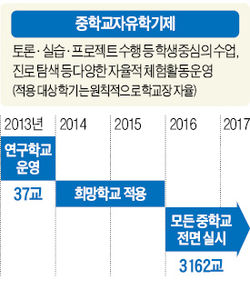 교육부는 이날 업무보고에서 ‘행복교육, 창의인재 양성’을 교육정책 비전으로 제시했다. 학생들이 학교에서 자신의 꿈과 끼를 키우고 진로를 설계할 기회를 갖도록 중학교 자유학기제를 2016년 전면 도입하기로 했다. 올 상반기 37개 연구학교를 지정하고 2014~2015년에는 희망하는 학교에 시행한 뒤 2016년 모든 학교로 확대하기로 했다. 초등학교의 온종일 돌봄 서비스를 무상화하기 위해 당장 내년부터 오후 5시까지의 방과 후 돌봄 프로그램을 전면 무상 제공하고 저소득층·맞벌이 대상인 오후 10시까지의 추가 돌봄 서비스는 내년 1, 2학년을 시작으로 2016년 5, 6학년까지 무상 제공하기로 했다. 고교 무상교육은 내년부터 단계적으로 확대해 2017년 완성할 방침이다.