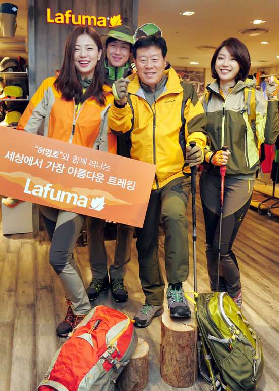 LG패션, 라푸마의 '네팔 트레킹 이벤트'를 홍보하기 위해 28일 서울 중구 소공동 롯데백화점 본점에서 산악인 허영호 대장과 모델들이 기념촬영을 하고있다. 네팔 트레킹 이벤트는 라푸마 고객 중 180 명을 선착순으로 선정, 오는 5월 허영호 대장과 함께 네팔에서 트래킹 및 다양한 현지 봉사활동 프로그램을 수행하는 행사이다.