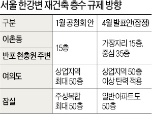 서울시가 여의도는 60층, 잠실은 50층 이상 초고층 건축물 신축을 허용하기로 했다. 또 조망권 침해를 이유로 15층 이하 중층 규제 지역으로 꼽혔던 이촌과 반포지구도 35층 재건축을 허가할 방침이다. 그동안 높이 규제에 따른 사업성 문제로 재건축 추진이 지지부진하던 이들 지역의 재건축이 탄력을 받을 수 있을지 관심이 쏠린다.서울시는 지난 1월 연 ‘한강변 관리방안’ 공청회에서 여의도는 50층으로, 잠실은 상업시설이 포함된 복합건물은 50층, 일반 아파트는 35층으로 층고를 규제하는 방안을 발표했다. 하지만 업무 중심인 여의도와 관광특구로 지정된 잠실의 특성을 무시한 결정이라는 해당 지역 주민들의 비난이 쏟아졌다.