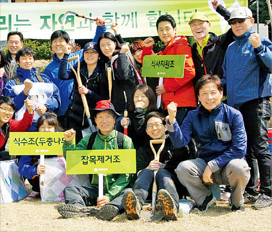 침구제조업체 이브자리(회장 고춘홍·맨 오른쪽)는 지난달 31일 경기 양평군 칠보산 일대에서 올해 신입공채 합격자 들과 식목를 겸한 입사신고 행사를 가졌다.