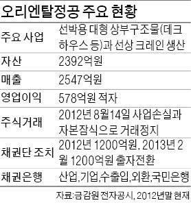채권단 관계자는 “오리엔탈정공은 선상크레인 분야에서 국내 시장 점유율 70%를 차지하고 있다”며 “최근 현대중공업에서 수주를 받는 등 수익성도 개선 조짐을 보이고 있다”고 설명했다. 이 회사 채권단은 산업은행(채권액 비율 38.5%) 기업은행(14.8%) 수출입은행(8.2%) 외환은행(6.5%) 국민은행(6.2%) 등으로 구성됐다.
