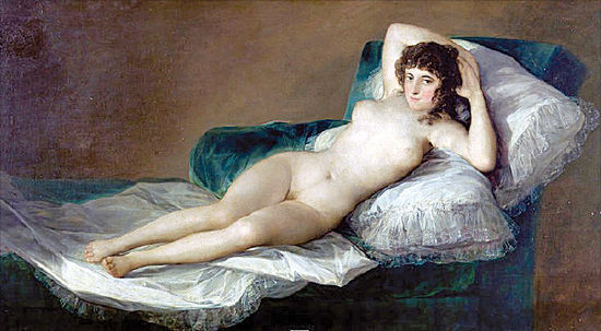18세기 말~19세기 초 스페인을 대표하는 화가 프란시스코 고야(1746~1828)의 ‘옷 벗은 마하’도 그런 남성이 바라본 여성 누드상의 전형이다. 당시 총리였던 고도이가 자기 방에 걸어 놓고 은밀히 감상하기 위해 주문한 이 작품은 관능성이라는 왜곡된 시각으로 바라본 여성상이다. 이 작품을 볼 수 있는 ‘특권’을 지닌 사람은 그와 아주 절친한 소수의 남자들뿐이었다고 한다. 다만 이 작품은 신화의 가면을 벗고 세속의 여인을 적나라하게 그린 최초의 누드상이라는 점에서 나름 의미를 갖는다.