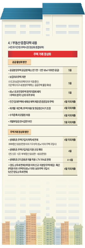 이와 함께 부동산시장이 과열됐을 때 도입한 다주택자 양도세 중과(세율 50~60%) 제도를 폐지하고 기본세율(6~38%)로 과세하는 소득세법 개정을 추진한다. 1년 내 주택 양도 때 세율을 50%에서 40%로, 2년 내 양도 때는 40%에서 기본세율로 과세하는 세법 개정에도 적극 나선다.