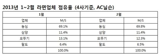 앞서 농심의 점유율은 2011년 8월 하얀국물 라면 꼬꼬면이 출시된 이후 조금씩 감소하다 나가사끼짬뽕과 기스면이 가세하면서 같은 해 12월 59.5%까지 내려앉은 바 있다.