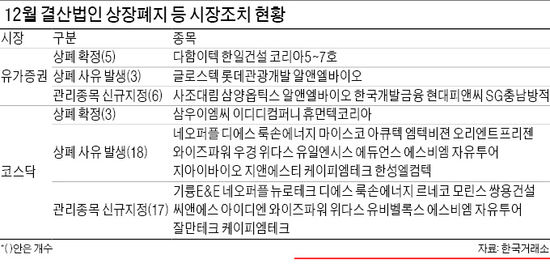 유가증권시장에서는 다함이텍, 한일건설, 코리아퍼시픽 5~7호 선박투자회사 등 5개 종목의 퇴출이 확정됐다. 다함이텍은 2년 연속 매출액 50억원 미만, 한일건설은 감사의견 거절 및 자본 전액잠식 사유로 16일 상장폐지된다. 역시 감사의견 거절을 받은 코리아 5~7호는 10일 상장폐지된다. 코스닥시장에서는 자본 전액잠식에 감사의견 거절을 받은 휴먼텍코리아, 자본 전액잠식된 삼우이엠씨, 반기 감사의견 거절 후 자본잠식률이 50% 이상인 이디디컴퍼니 등 3개사의 상장폐지가 확정돼 12일 일괄 퇴출된다.