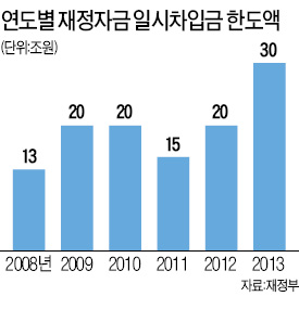 정부의 일시차입금 규모는 매년 커지고 있지만 돈 가뭄은 더욱 심해지고 있다. 올해 일시차입금 한도액은 2년 전인 2011년(15조원)의 두 배다. 한 민간 경제연구소 관계자는 “일시차입금 계정은 추가 세수 등을 통해 부분적으로 메워나갈 수 있지만 정부가 대규모 추경을 단행하고도 경기가 살아나지 않으면 정해진 기간에 돈을 갚지 못할 수도 있다”고 말했다.