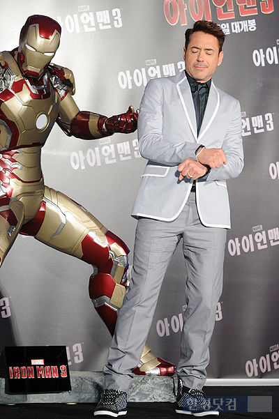 할리우드 배우 로버트 다우니 주니어가 4일 오전 서울 여의도 콘래드호텔에서 열린 영화 '아이언맨3'(감독 쉐인 블랙) 내한 기자회견에 참석해 싸이의 '강남스타일' 말춤을 추고 있다.