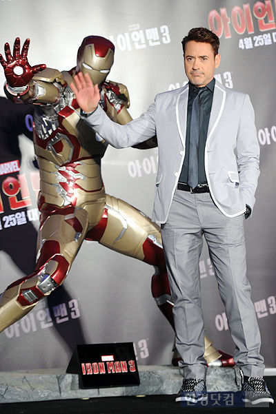 할리우드 배우 로버트 다우니 주니어가 4일 오전 서울 여의도 콘래드호텔에서 열린 영화 '아이언맨3'(감독 쉐인 블랙) 내한 기자회견에 참석해 포토타임을 갖고 있다.