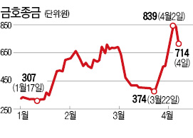 검찰이 금호종금의 회계처리 위반과 관련해 수사관들을 보내 관련자료를 받아갔다. 우리금융지주가 금호종금을 인수하지 못할 가능성까지 제기되면서 금호종금은 하한가로 추락했다. 4일 금호종금은 14.90% 떨어진 714원에 마감했다. 금호종금은 우리금융으로 인수될 것이란 기대에 지난달 25일부터 지난 2일까지 124.33% 급등했다. 지난 3일엔 투자경고종목으로 지정되기도 했다.