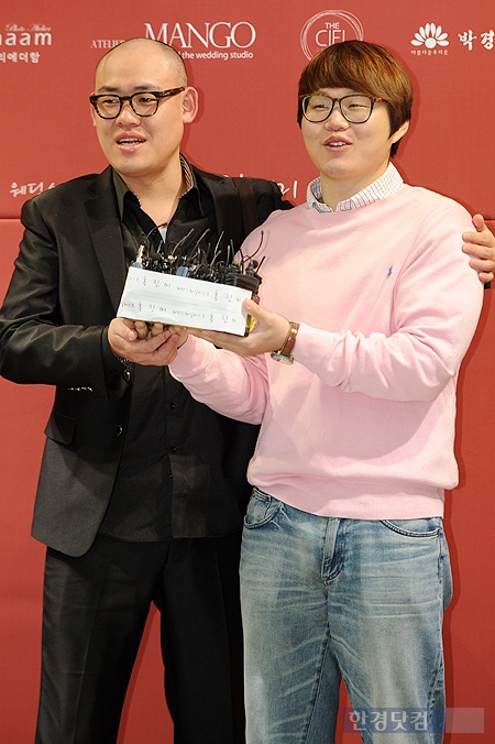 개그맨 이원구, 최효종이 20일 오전 서울 대치동 컨벤셩 디아망에서 4살 연하의 일반인 여자친구와 백년 가약을 맺는 개그맨 김준현의 결혼식에 하객으로 참석해 포토타임을 갖고 있다.