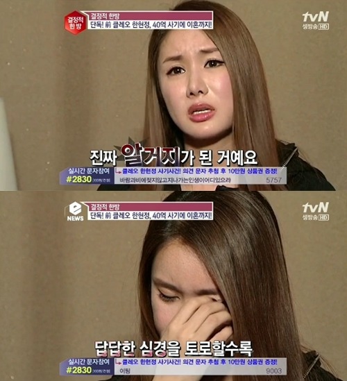 인기 걸그룹 클레오 출신 한현정이 중국인 부호 남편 무모씨와 이혼 소송에 휘말리며 자살시도까지 했다고 눈물 고백했다.