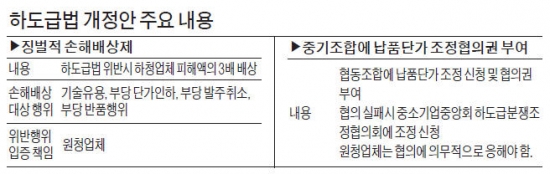 먼저 1984년 법 제정 이후 30년 만에 바뀐 하도급법 개정안은 대기업-중소기업, 중소기업-중소기업 간 하도급 관행에 큰 변화를 가져올 전망이다. 중소기업중앙회는 이날 “하도급법 개정안 통과를 환영한다”는 논평을 냈지만 후폭풍은 대기업은 물론 중소기업에도 미칠 것으로 보인다.