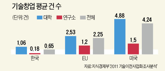 연구실 창업의 요람이 돼야 할 대학의 인식도 문제다. 창업 지원 관련 내부규정을 갖고 있는 대학교는 32.5%, 연구기관은 23.4%에 불과하다. 이 규정이 없는 기관 소속 교수나 연구원은 창업을 정식으로 인정받지 못해 다양한 불확실성에 직면하게 된다. 이광형 KAIST 교수는 “KAIST에서조차 창업은 해봤자 ‘골치만 아픈 일’로 생각하는 경향이 강하다”며 “창업 경력도 인정하는 외국과 달리 한국은 학생이든 교수든 한눈을 팔고 새로운 시도를 하면 고달파진다”고 말했다.