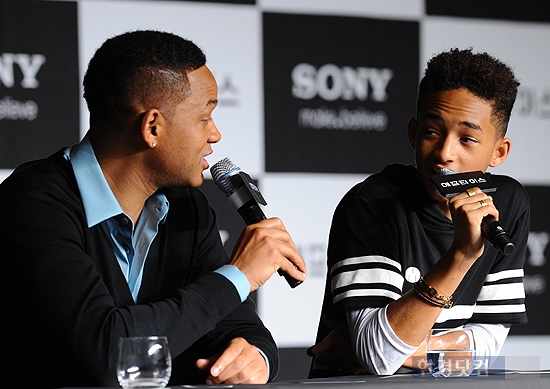 영화 '애프터 어스'(감독 M. 나이트 샤말란) 홍보차 내한한 할리우드 배우 윌 스미스, 제이든 스미스 부자가 7일 오후 서울 여의도 콘래드 서울호텔에서 열린 기자회견에 참석해 대화를 나누고 있다.