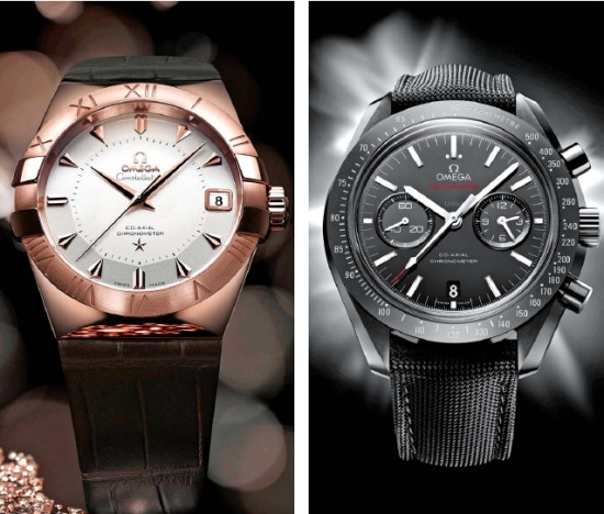 오메가는 스포티한 시계 라인 ‘스피드마스터’(Speedmaster)에서 ‘블랙 세라믹’(Black ceramic) 시계를 올해 처음 출시했다. 블랙 지르코늄 산화 세라믹 소재로 다이얼을 만들었기 때문에 까만색이 더 선명하다. 44.25㎜의 큼직한 사이즈에 18K 화이트 골드로 인덱스를 만들었다. 크로노그래프(시간 속도 거리 등을 측정하는 장치)로 9시 방향과 3시 방향에 서브 다이얼을 만들었고 6시 방향에 날짜 창을 달았다. 12시 방향의 두개 점과 시간, 분, 크로노그래프 속 핸즈를 야광 처리해 아주 조금의 빛만 있는 곳에서도 쉽게 시간을 확인할 수 있다. 내구성이 높은 블랙 코듀라 스트랩(시곗줄)을 달았고 50m 방수가 가능하다.