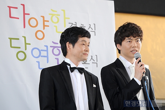 영화 제작자 겸 감독 김조광수(왼쪽)와 19살 연하 동성파트너 김승환 레인보우팩토리 대표가 15일 오후 서울 사당동 아트나인 야외무대에서 결혼 기자회견을 열고 소감을 밝히고 있다.