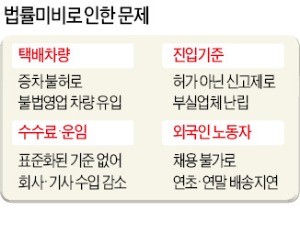 정부도 미온적이긴 마찬가지다. 국토교통부 관계자는 “큰 틀에서 택배법 제정을 통해 택배가 산업으로 육성될 수 있는 기반을 마련해야 한다는 데는 이견이 없다”면서도 “하지만 다른 사업자들과의 이해관계 조정을 우선해야 하고 소비자들의 택배이용료 증가에 대한 대책도 마련해야 한다”고 말했다.