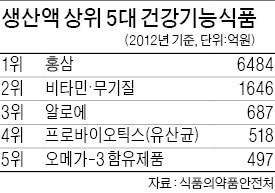 지난해 건강기능식품 중 숙취 예방 효과로 인기를 끌었던 헛개나무 음료가 시들해지고 대신 장질환 예방 효과가 있다는 프로바이오틱스(유산균) 매출이 크게 늘어난 것으로 나타났다. 홍삼과 알로에, 오메가-3 등은 변함 없는 사랑을 받았다.식품의약품안전처에 따르면 작년 홍삼 제품의 매출은 6484억원으로 2004년부터 건강기능식품 판매 순위에서 부동의 1위를 지키고 있다. 전체 건강기능식품 매출의 절반(46%)을 차지했다. 그 뒤를 이어 비타민 등 영양보충제(1646억원), 알로에(687억원), 프로바이오틱스(518억원), 오메가-3(497억원) 등의 순이었다.
