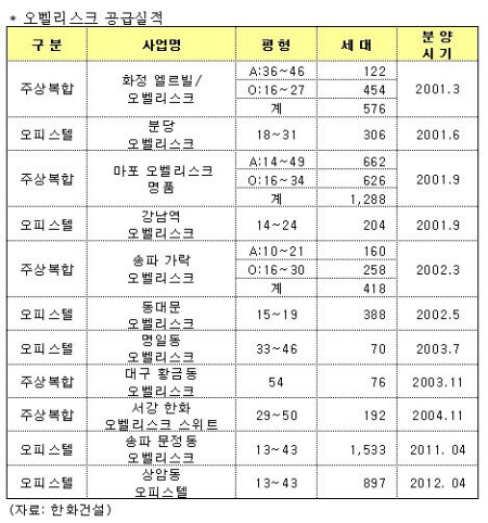 2011년에는 송파구 문정동에서 강남권 최대규모의 오피스텔 단지 ‘송파 한화 오벨리스크’ 계약이 단기간에 100% 완료돼 화제를 모았다. 일반청약에서 최고 12.16 대 1, 평균 8.12대 1의 높은 경쟁률로 전 군이 마감됐으며 1주일도 안돼 100% 계약에 성공했다. 1533실에 달하는 대규모 오피스텔이라는 점을 고려하면 이례적이다.