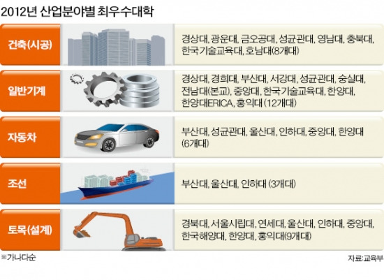 평가 결과 자동차 분야에서 잘 가르치는 대학은 성균관대 한양대 중앙대 인하대 부산대 울산대 등 6곳이 뽑혔다. 성균관대와 한양대는 2008년 첫 평가에서도 우수대학으로 뽑혔으나 고려대는 이번 평가에 불참해 탈락했다.