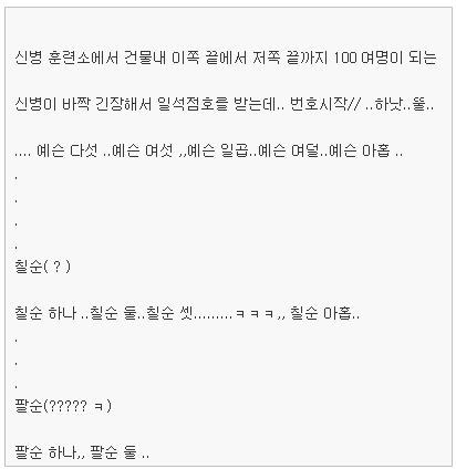 특히 다음 신병도 계속 이어서 '칠순 하나', '칠순 둘'로 번호를 이어 갔으며 괴상한 번호는 '팔순'까지 이어졌다는 내용이어서 네티즌의 폭소를 자아냈다.