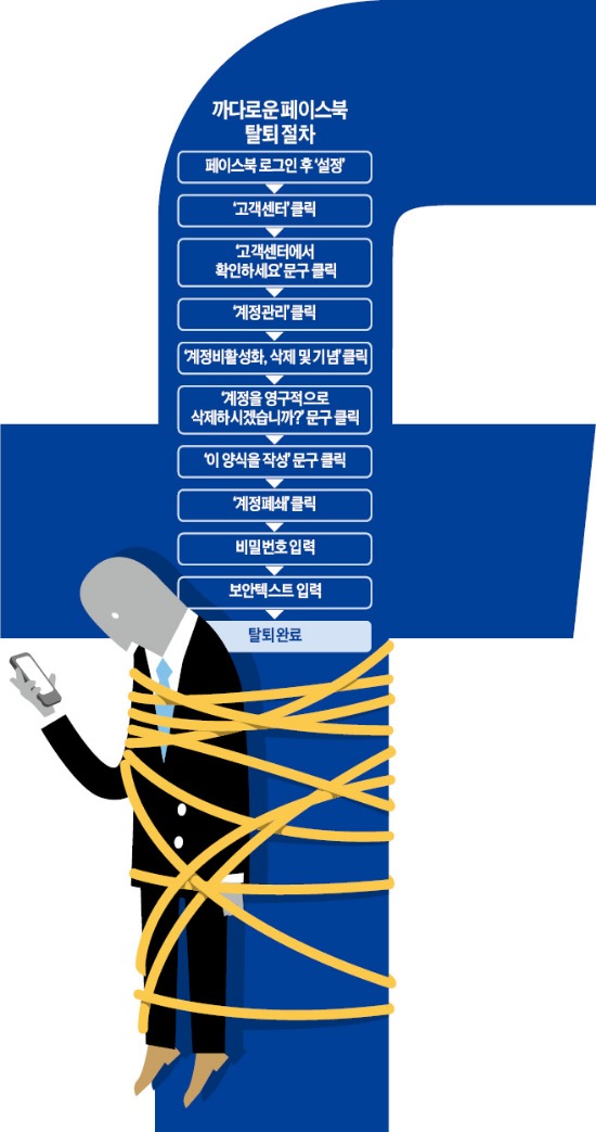대기업에 다니는 직장인 A씨(40)는 최근 페이스북을 탈퇴하기로 했다. 친구가 페이스북을 해킹당해 피해를 봤기 때문이다. ‘내 사진과 개인정보도 인터넷상에서 유출될 수 있다’는 생각에 갑자기 불안해졌다. 그런데 페이스북을 샅샅이 뒤져도 ‘탈퇴하기’ 버튼을 찾을 수 없었다. 30여분을 헤매다 지친 그는 인터넷 검색창에 ‘페이스북 탈퇴하는 법’을 입력해봤다. 결과를 보고 깜짝 놀랐다. 탈퇴 절차가 무려 10여단계에 이를 정도로 길고 복잡했기 때문이다.